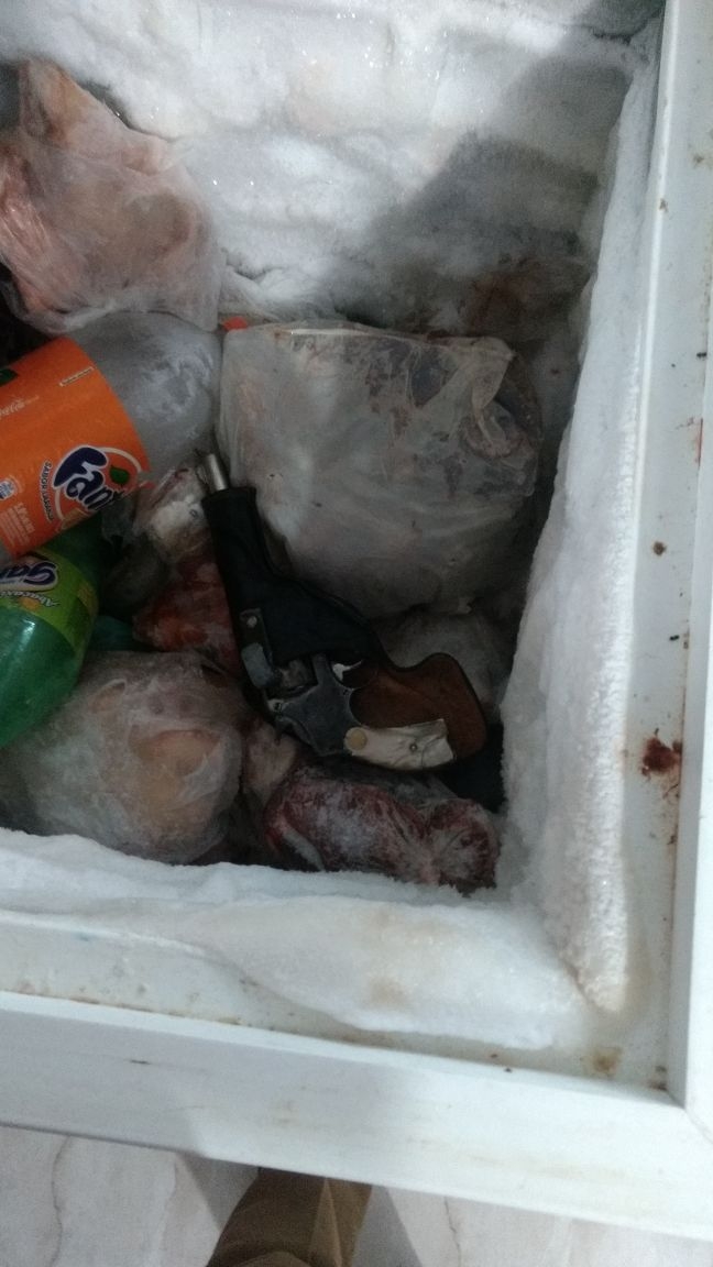 Na segunda situação, na Linha Santa Catarina, mais uma mandado por porte ilegal de arma, a policia chegou na residência do acusado e deu voz de prisão. A equipe também fez buscas na residência e a Soldado Sandreia encontrou no freezer da casa do acusado, em meio às carnes um revolver calibre 38, marca HO, sem numeração aparente, com capacidade para seis tiros e que estava carregado com cinco munições intactas.