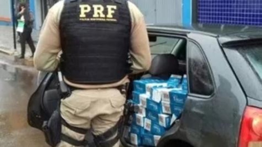 Os policiais realizavam patrulhamento ostensivo quando perceberam a aproximação de um VW/Gol, com placas de Santiago (RS). Ao ser abordado a equipe constatou que o veículo estava carregado com cigarros e que o motorista utilizava um rádio transmissor portátil.