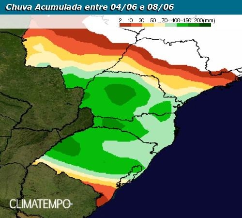 Confira no mapa o acumulado de chuva previsto para o Sul do Brasil entre domingo (4) e quinta-feira (8). Grande parte do interior da Região deve acumular mais de 100mm.
