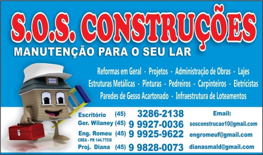 S.O.S Construções- Manutenção para o seu lar na Avenida Tancredo Neves, nº 455, próximo á Prefeitura e a Igreja Assembleia de Deus.