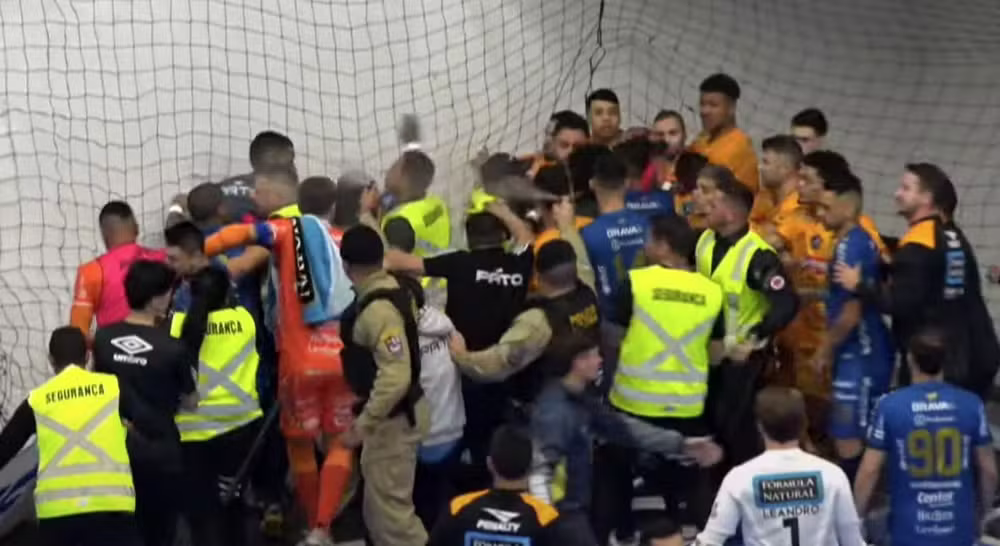 Logo depois, seguranças particulares se envolveram em uma briga com jogadores do Sorocaba, perto da saída de quadra. A confusão continuou no túnel de acesso aos vestiários.