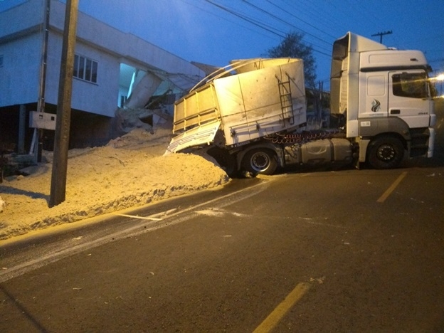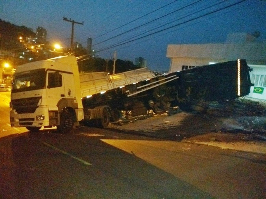 O condutor tentou descer de ré pelo morro, mas perdeu o controle e acabou fazendo um “L” (quando a carreta toma o sentido contrário do cavalo mecânico) e foi de encontro a uma residência.