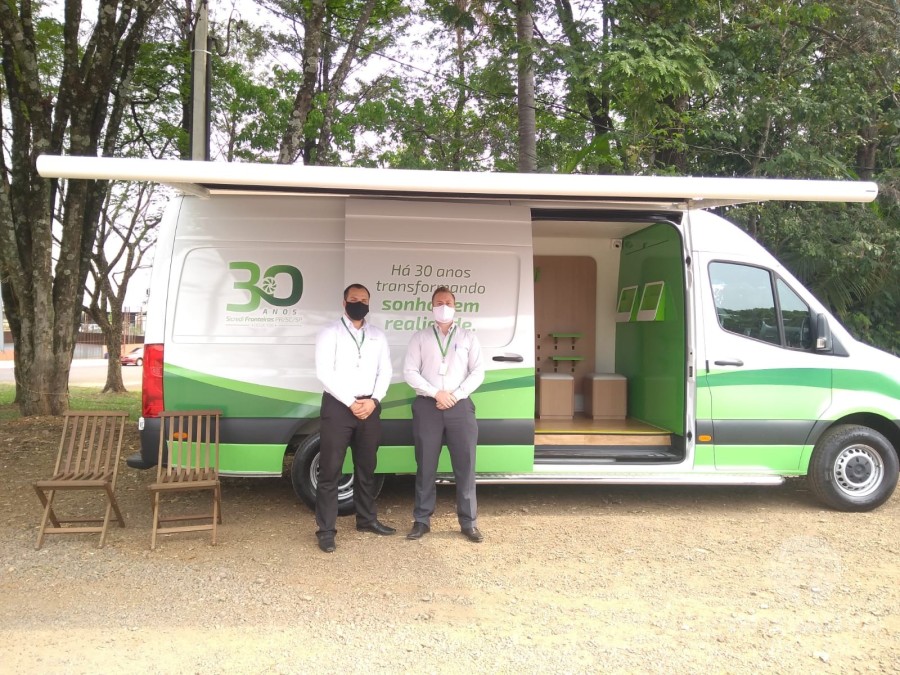 Na van do Sicredi é possível fazer simulações de financiamentos e até abrir uma conta corrente.