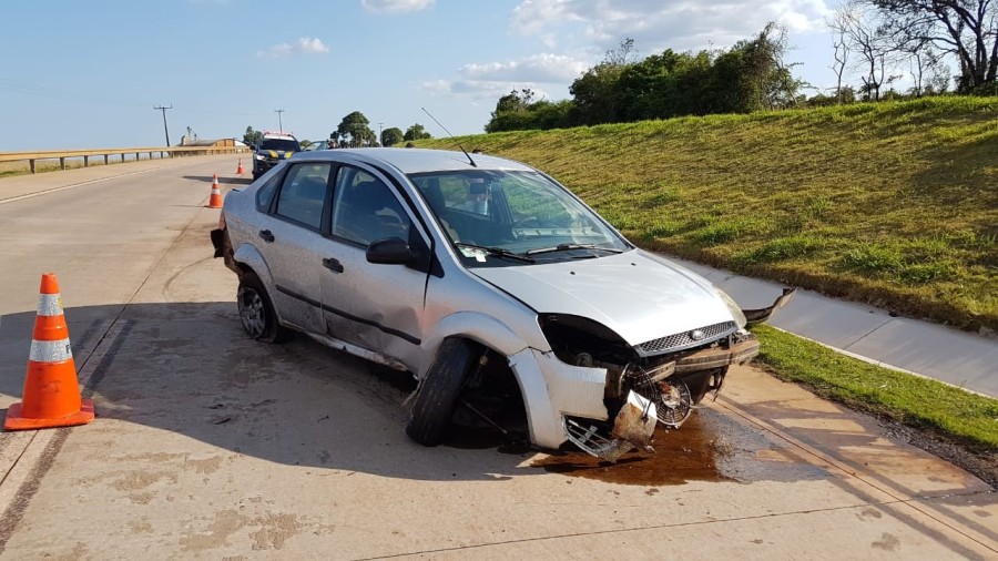 Segundo informações, um veículo ocupado por um casal seguia pela pista, momento em que um dos pneus estourou e o Fiesta capotou.