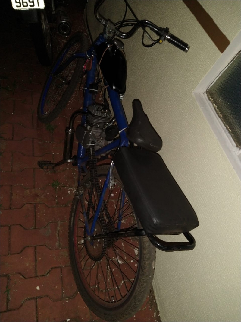 Feita a confecção do boletim de ocorrência e as notificações cabíveis, os policiais retomaram as rondas na área central do município, onde foi avistada uma bicicleta motorizada transitando pelas ruas.