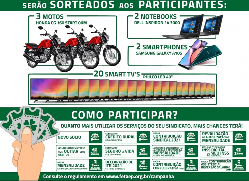 Serão sorteados 03 motos Honda Cg 160 - 0 km, 02 Notebooks, 02 Smartphones e 10 Smarttv’s. Além disso, uma smart TV será sorteada exclusivamente entre os participantes do município de Capitão.