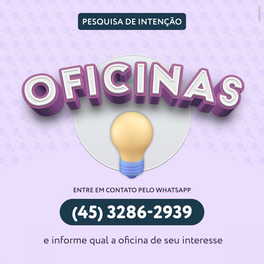 Caso haja interesse em participar de alguma dessas oficinas, basta entrar em contato pelo WhatsApp n° 45 3286-2939 e informar seu NOME COMPLETO e CURSO QUE DESEJA FAZER.