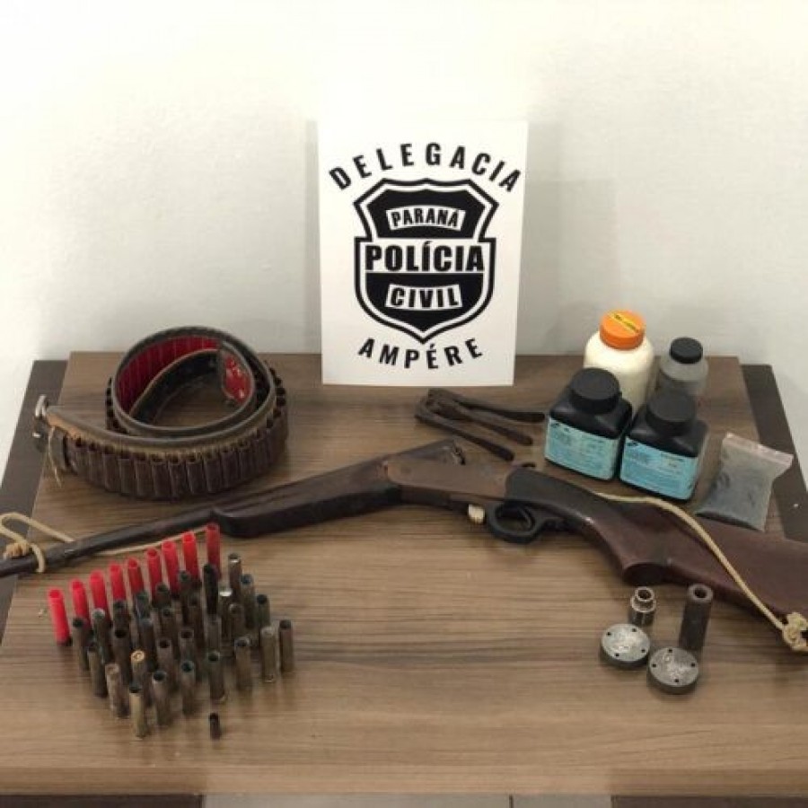 O investigado de 51 anos, foi localizado e cientificado do teor da ordem judicial. Em razão das ameaças noticiadas por sua esposa, foram realizadas as buscas no imóvel, sendo localizada uma arma de fogo do tipo espingarda calibre 36 além de munições e material para recarga.