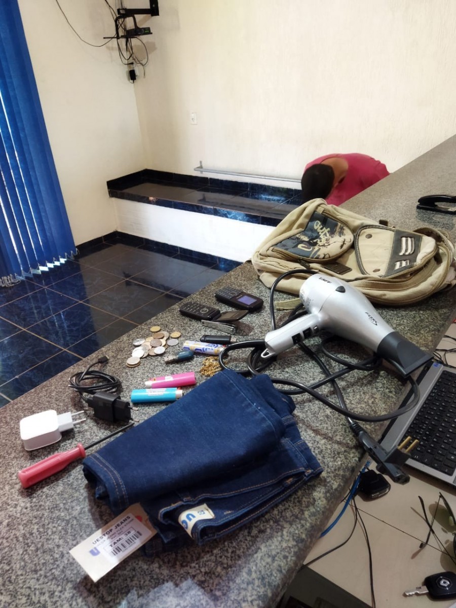 A PM foi ao local e constatou o fato e após diligências avistaram um rapaz que estava com uma mochila nas costas. O individuo foi abordado e dentro da mochila os policiais encontraram um secador de cabelo de cor prata, uma calça jeans, uma corrente dourada, um carregador de celular, dois pen-drives e 1 chave de fenda.