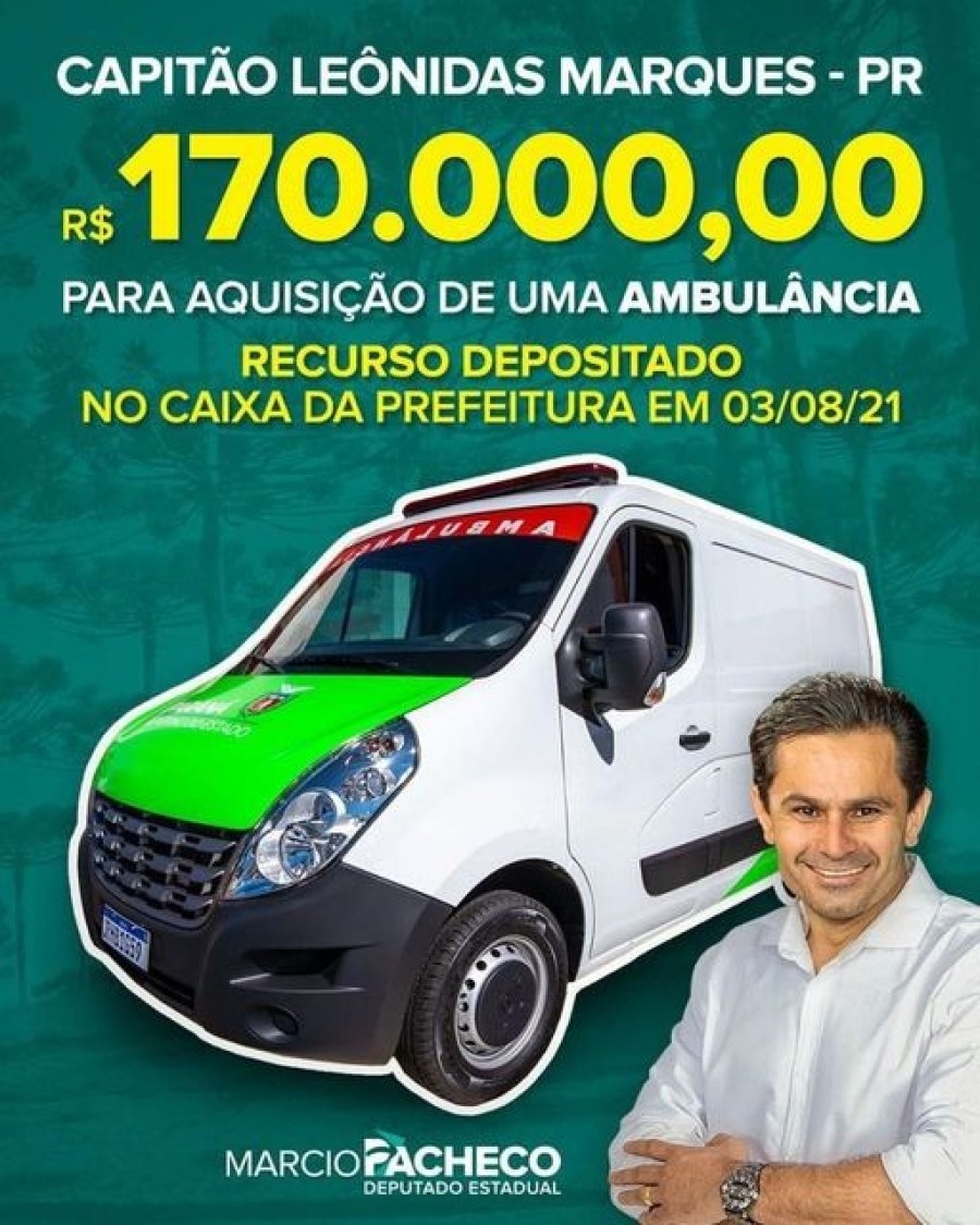 O valor já foi liberado e depositado na conta da prefeitura, que será responsável pelo processo de licitação pública, para a aquisição do veículo. O prefeito de Capitão Leônidas Marques, Maxwell Scapini, agradeceu o apoio do deputado Pacheco em favor do apoio as demandas da cidade.