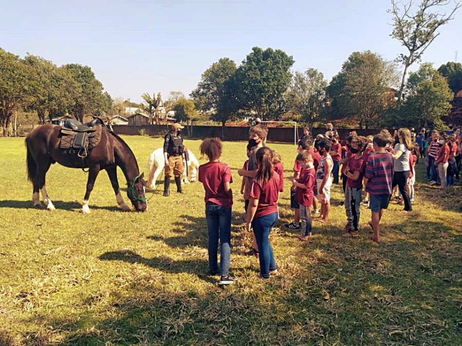 Nessa primeira parada, a Cavalaria foi até o distrito de Alto Alegre do Iguaçu - apresentar os cavalos aos alunos das escolas do distrito.