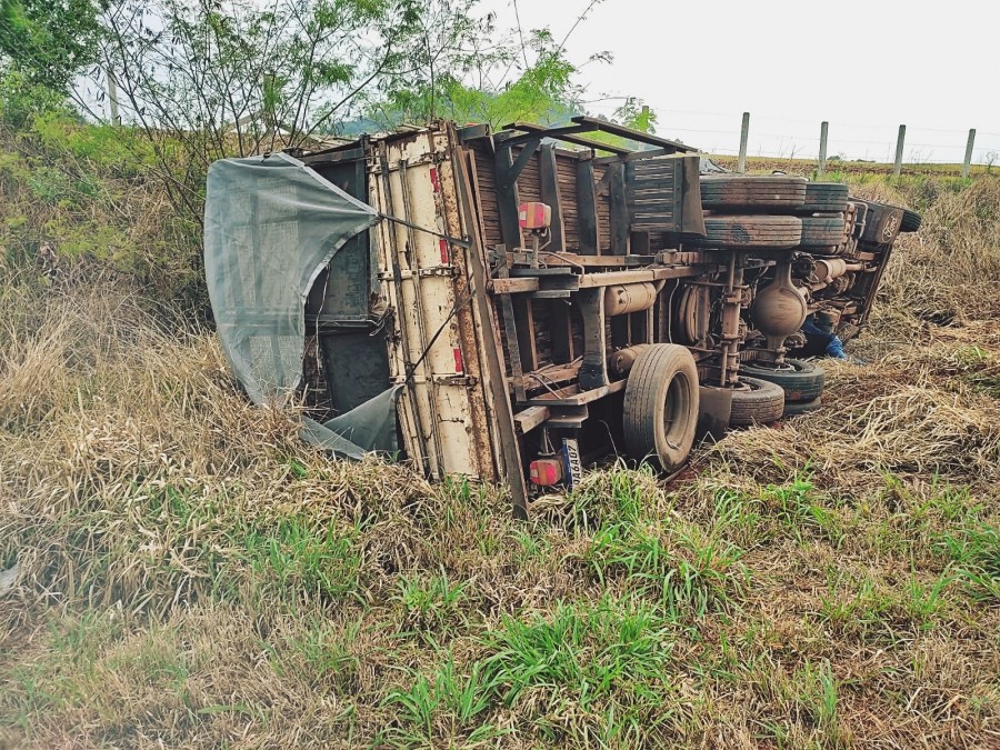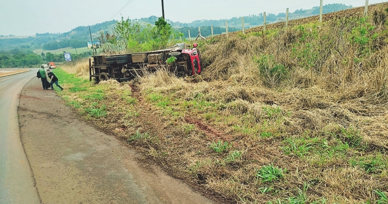 O acidente envolveu um caminhão Ford Cargo 2423, que acabou tombando as margens da via.