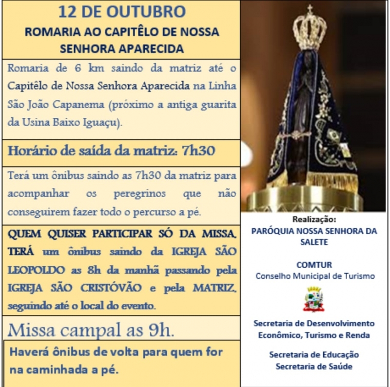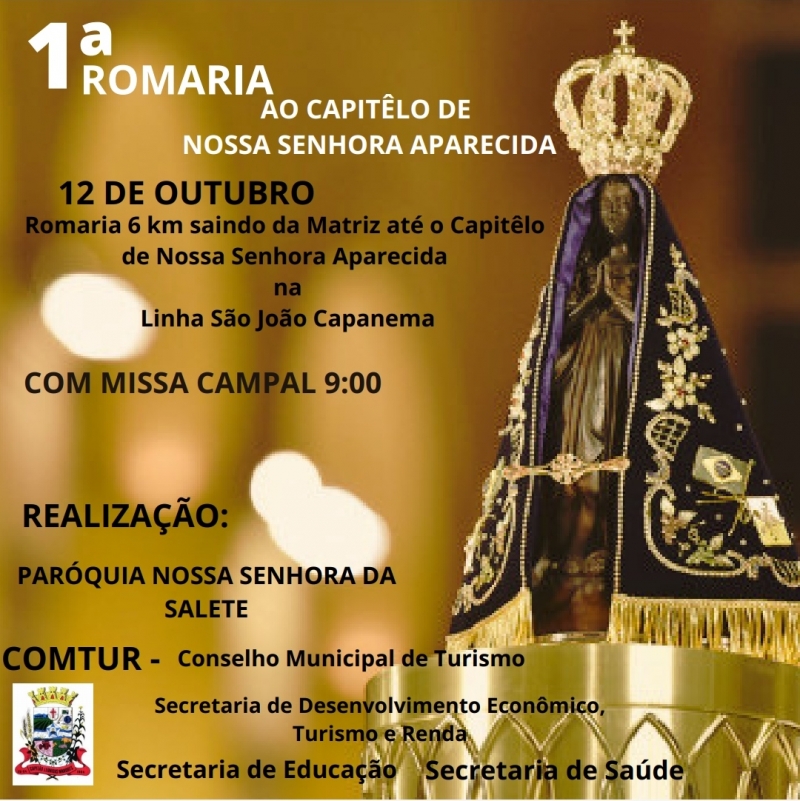 A programação estabelecida é sair da Igreja Matriz às 7h30 em procissão até o Capitel de Nossa Senhora Aparecida na Linha São João Capanema. No local será realizado às 9:00 horas uma Missa Campal pelo Pároco - Frei Luiz Antônio Ceriolli.