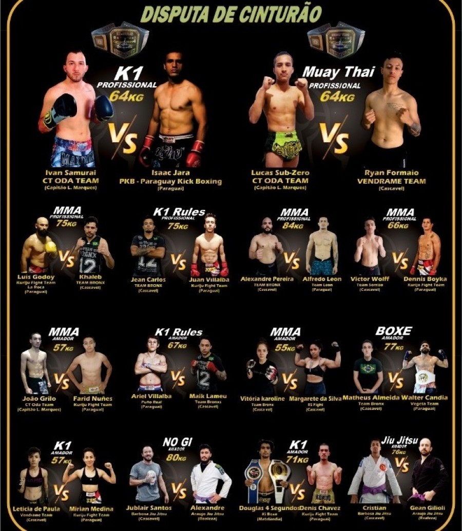 Haverá lutas de MMA, K1, MUAY THAI e JIU JITSU, contando com lutas internacionais.