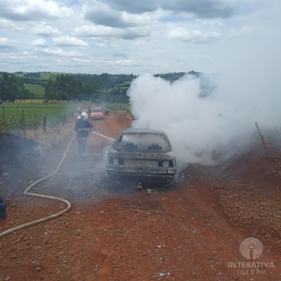 Após uma pane elétrica, o veículo VW Santana acabou pegando fogo e sendo consumido pelas chamas antes da chegada do Corpo de Bombeiros.