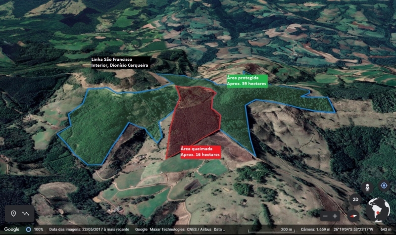 A área queimada foi de aproximadamente 16 hectares, foram protegidos mais de 59 hectares entre matas nativas, reflorestamentos de pinos e eucaliptos, além de plantações de milho e outros.