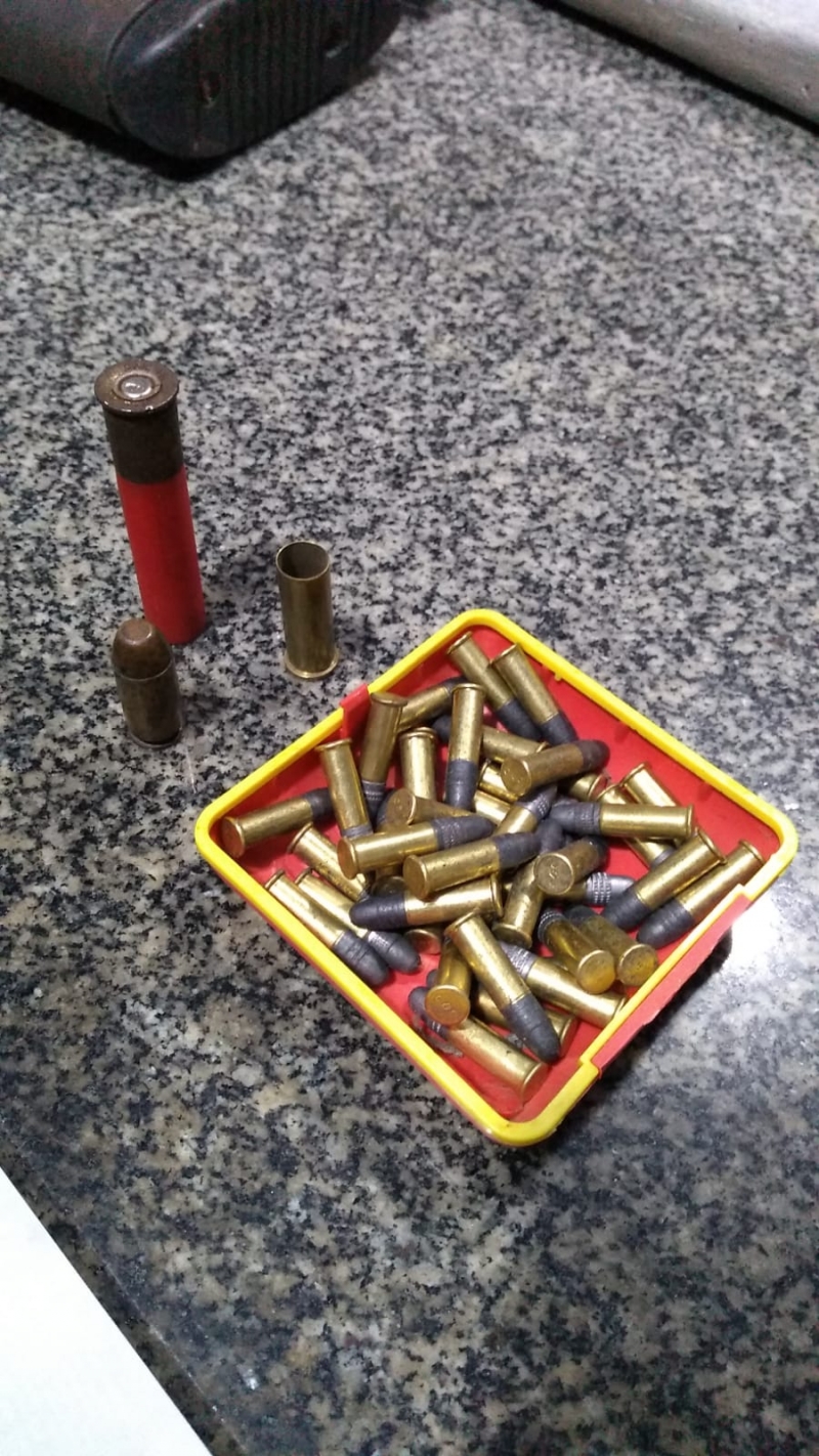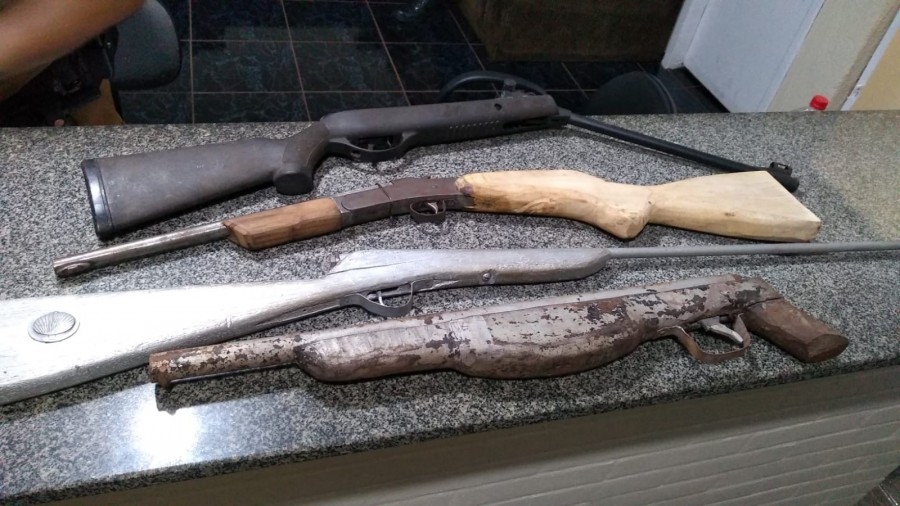 Em cima do guarda-roupas foi encontrada uma espingarda de pressão adaptada para calibre 22 municiada, mas a vítima relatou que não seria essa a arma das ameaças, então em nova revista foi encontrado no tanque uma espingarda de cor prata fabricação caseira, foi localizada ainda mais duas espingardas calibre 36 municiada e outra calibre 12, e diversas munições de calibre 22, 40, 36, e 38.