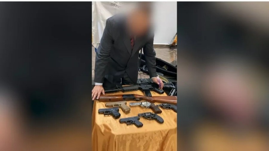 No início o delegado da Polícia Civil Tito Barichello fala que estão na igreja e mostra o armamento em cima de uma mesa. Ao todo são oito armas apresentadas.