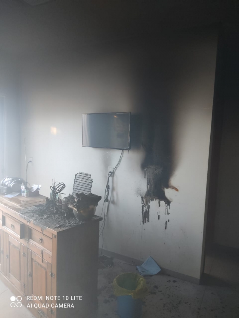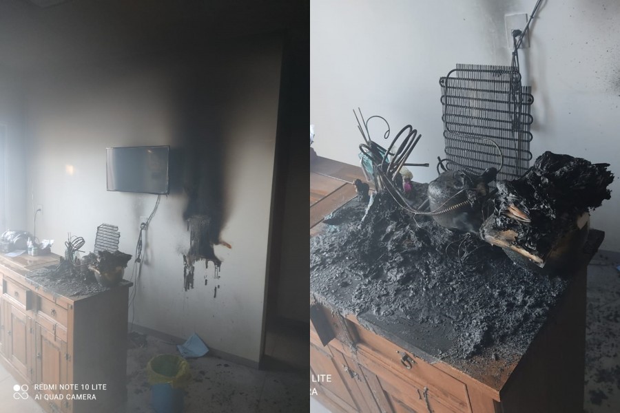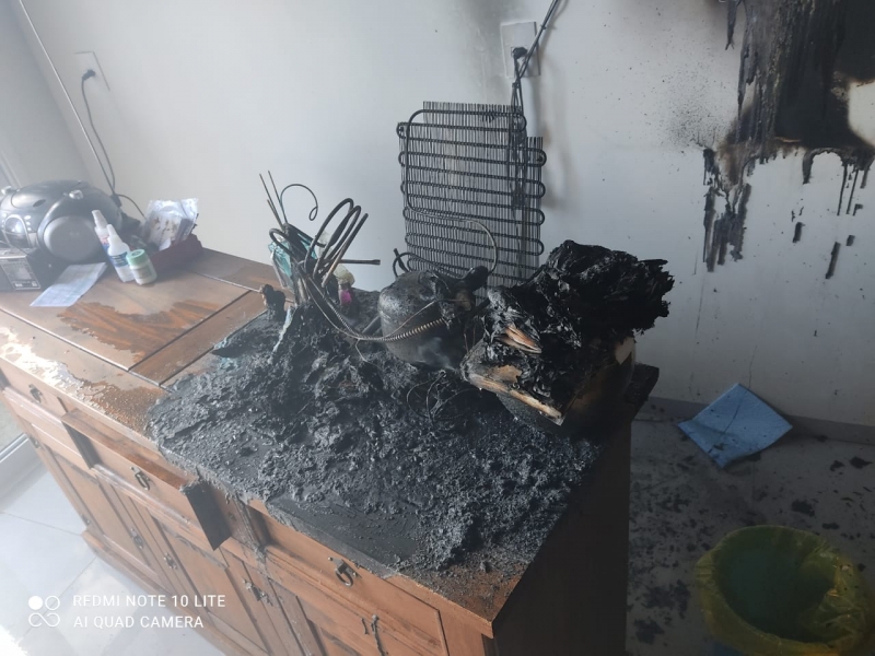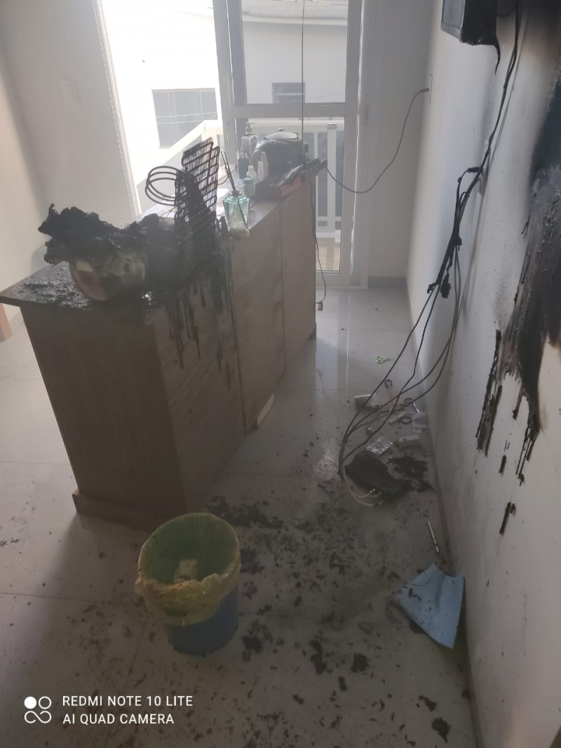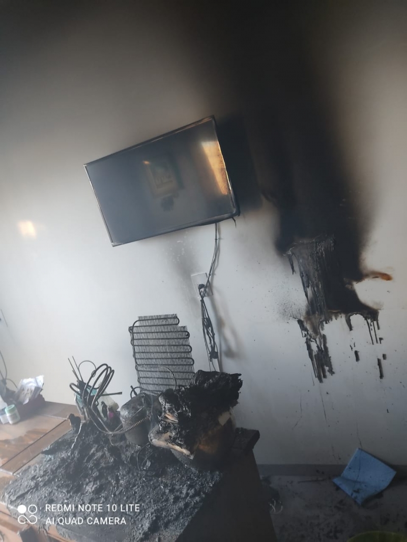 No local, os moradores relataram que o incêndio iniciou e um bebedouro de água que estava sobre um balcão e se propagou para um televisor.