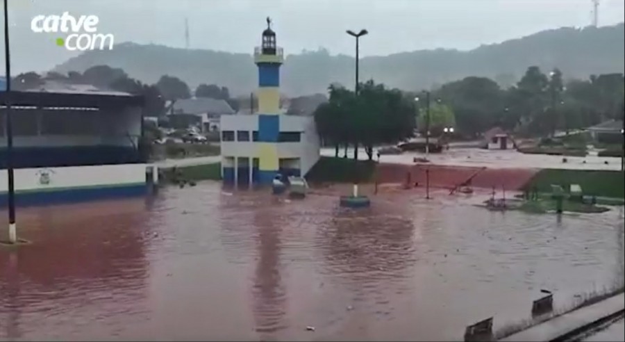 Nas imagens que circulam pela internet, é possível perceber a força da enxurrada passando pelas ruas. A praça foi tomada pela água.