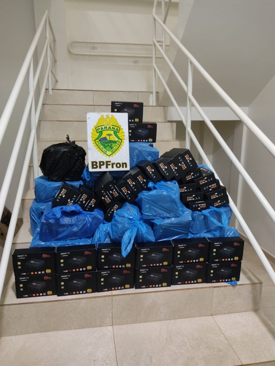 No bagageiro foram encontrados 185 aparelhos de tv box de origem estrangeira.
