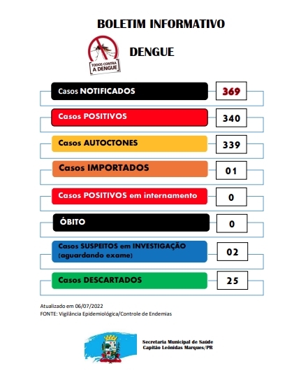 Já em Capitão Leônidas Marques a Secretaria Municipal de Saúde conta com 369 casos notificados sendo 340 positivos.
