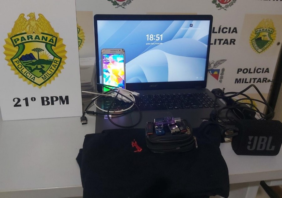 A equipe Policial Militar efetuou a abordagem e na bolsa que o mesmo trazia consigo encontrou uma pedra da droga popularmente conhecida como crack e ainda: um notebook, um aparelho de telefone celular, uma caixa de som JBL, uma camiseta e mais alguns objetos.