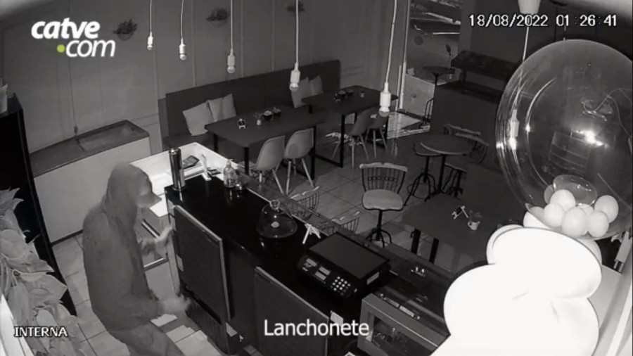 A segunda ação criminosa aconteceu em uma lanchonete, na imagem é possível perceber que apenas um suspeito invade a loja, enquanto o outro espera do lado de fora.
