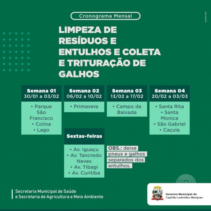 Essa é uma ação da Secretaria de Saúde, Secretarias de Obras e Meio Ambiente. Até o momento, mais de 4 toneladas de resíduos foram retirados e encaminhados ao aterro municipal. Ainda, os donos de terrenos que estão com mato alto estão sendo notificados pela Secretaria de Saúde, através da equipe de endemias, para que realizem a limpeza e roçada, caso não atendam a notificação no prazo de 10 dias, os proprietários poderão ser multados.
