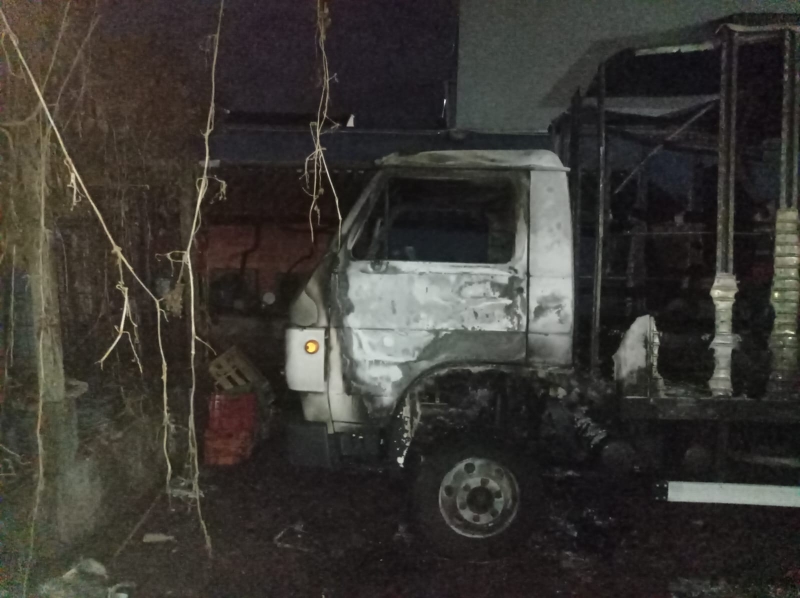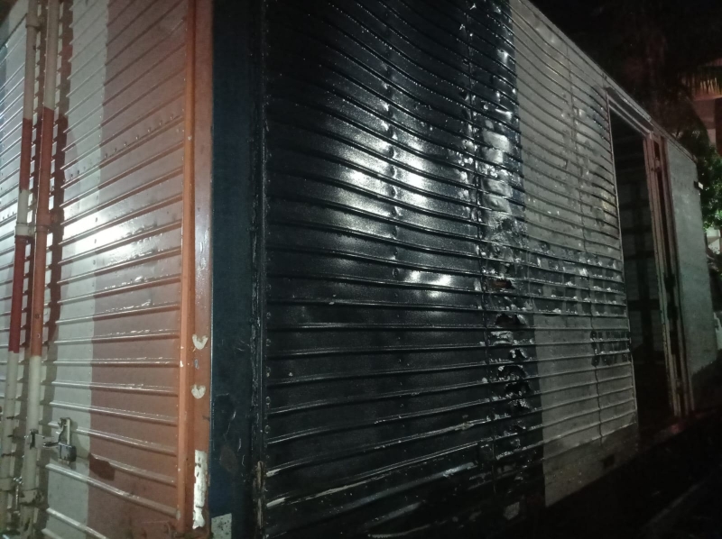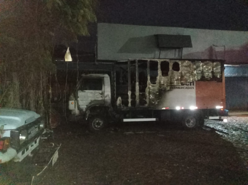 O fogo atingiu um caminhão do Supermercado Demenech que estava estacionado nos fundos do depósito.