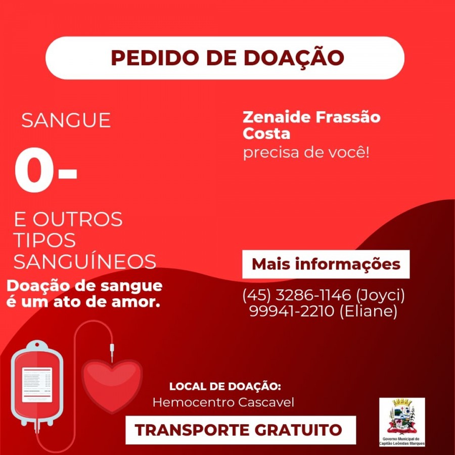 Para você que é do tipo sanguíneo O- e tem interesse em ajudar, basta entrar em contato com a Assistente Social – Joyci pelo telefone (45) 3286-1146, ou com a Eliane pelo telefone (99941-2210). A doação de sangue acontece no Hemocentro de Cascavel, e o transporte é totalmente gratuito.