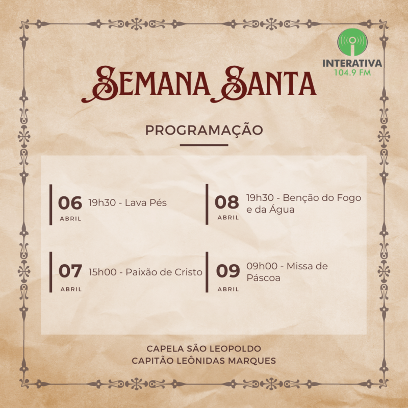 Já no domingo (09) a missa acontece as 09h00 também na Capela São Leopoldo.