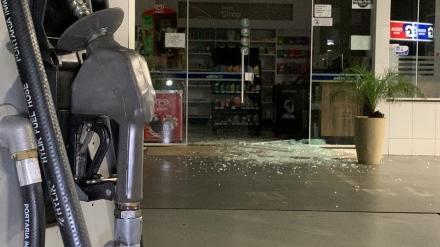 Os criminosos estouraram a porta de vidro da loja de conveniência, invadiram o local e furtaram cigarros e barras de chocolate.
