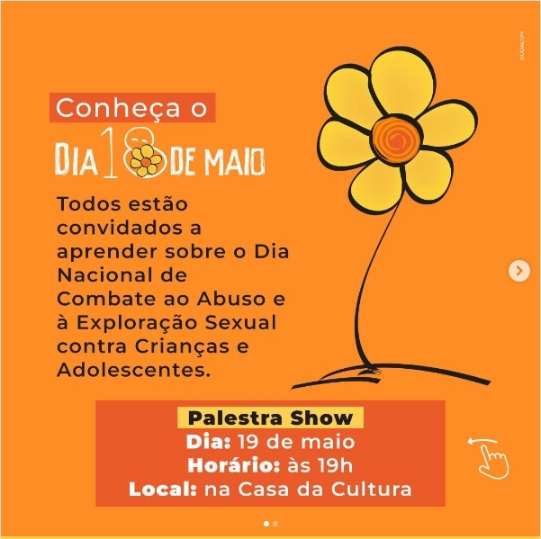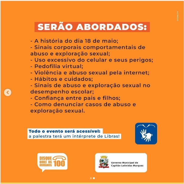 No evento, serão abordados temas como a história do dia “18 de maio”, sinais corporais e comportamentos, uso excessivo do celular e seus perigos, pedofilia virtual, violência e abuso sexual pela internet, hábitos e cuidados, entre outros assuntos pertinentes.