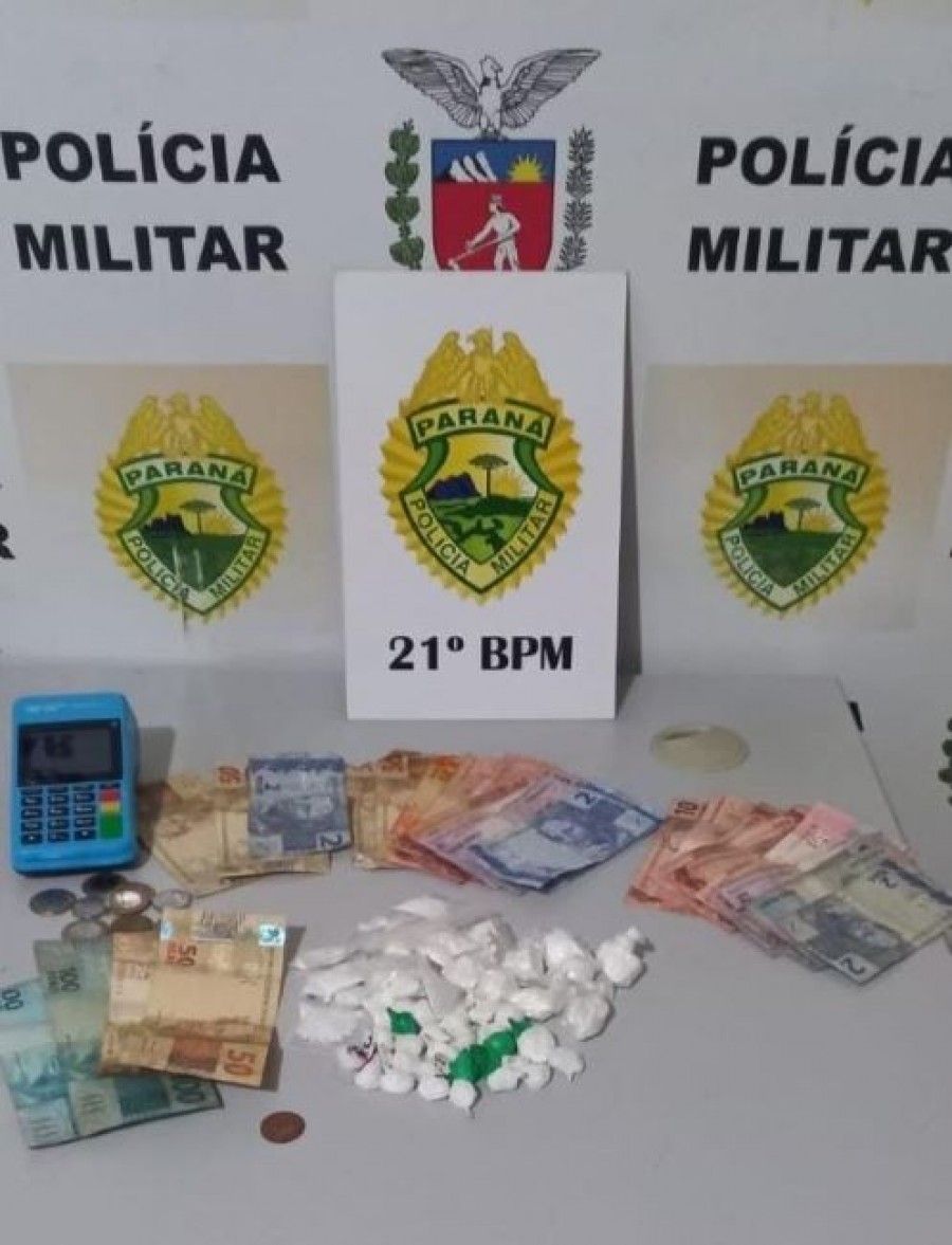 Durante a busca pessoal, os policiais encontraram na mochila do condutor uma máquina de cartão e R$ 304,30 em dinheiro, enquanto na mochila da passageira foram encontradas várias porções da droga ilícita "cocaína", totalizando 96g, além de R$ 504,00 em dinheiro.