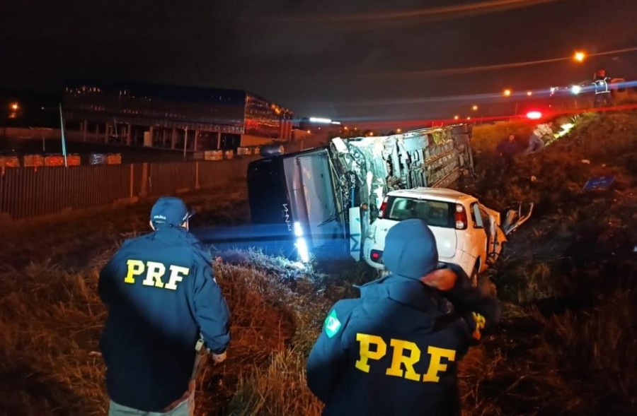 Com o impacto, os dois veículos foram jogados para fora da rodovia. O carro ficou com a frente destruída e o coletivo tombou.