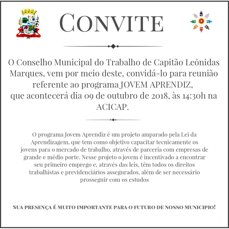 O Conselho Municipal do Trabalho de Capitão Leônidas Marques está convidando os empresários do município para uma importante reunião para discutirem sobre o programa Jovem Aprendiz. A reunião acontece às 14h30 desta terça feira (09) na ACICAP ( Associação Comercial e Industrial de Capitão).