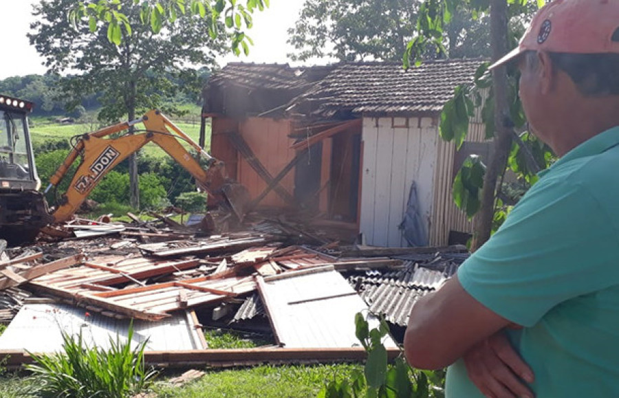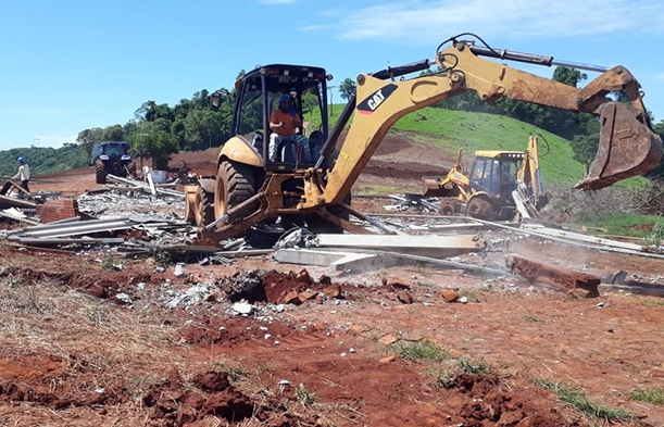 Uma retro escavadeira hidráulica foi utilizada para demolir um barracão onde eram guardados os maquinários usados na lavoura. As famílias tiveram que carregar a mudança e deixarem o local.