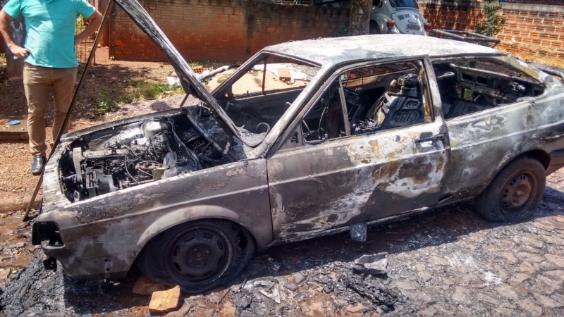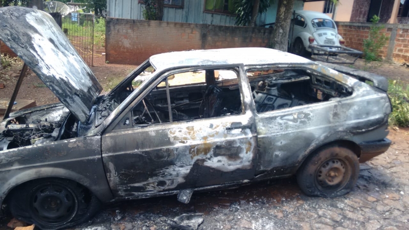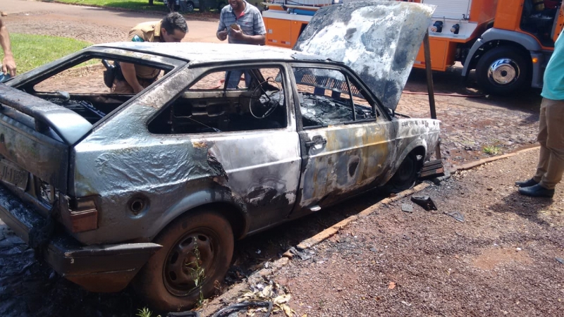 Um veiculo VW Gol, ficou completamente destruído pelo fogo nesta segunda-feira (05), Avenida Curitiba, próximo à Delegacia, no município de Santa Lúcia.