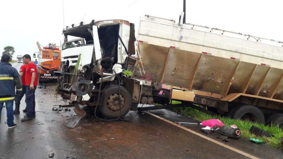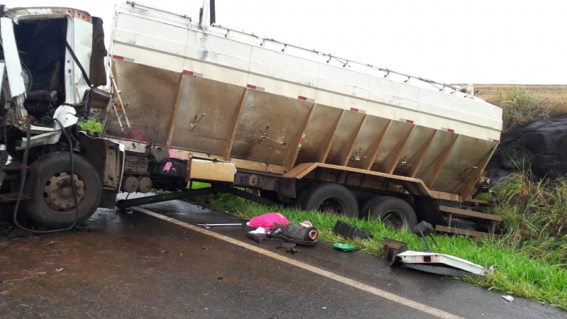 Os dois bateram contra o barranco. O caminhão de ração bateu nas pedras no barranco e acabou ficando com a cabine na pista.