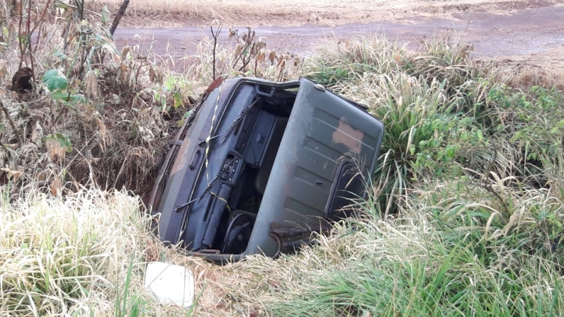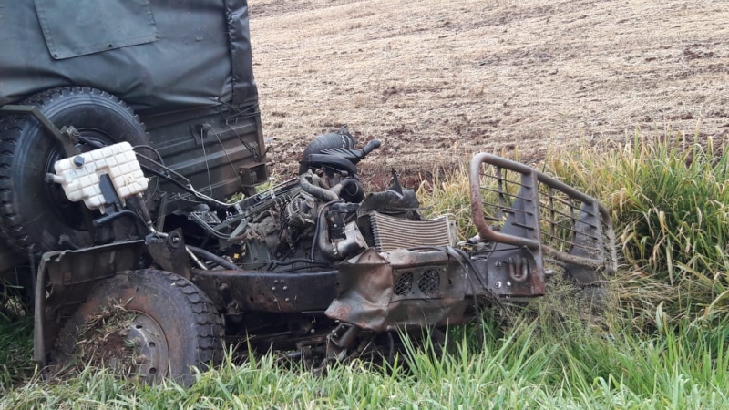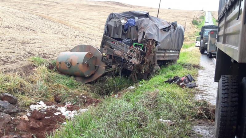 O caminhão do Exército caiu em uma valeta fora da rodovia. Nele estavam dois ocupantes que sofreram ferimentos leves.