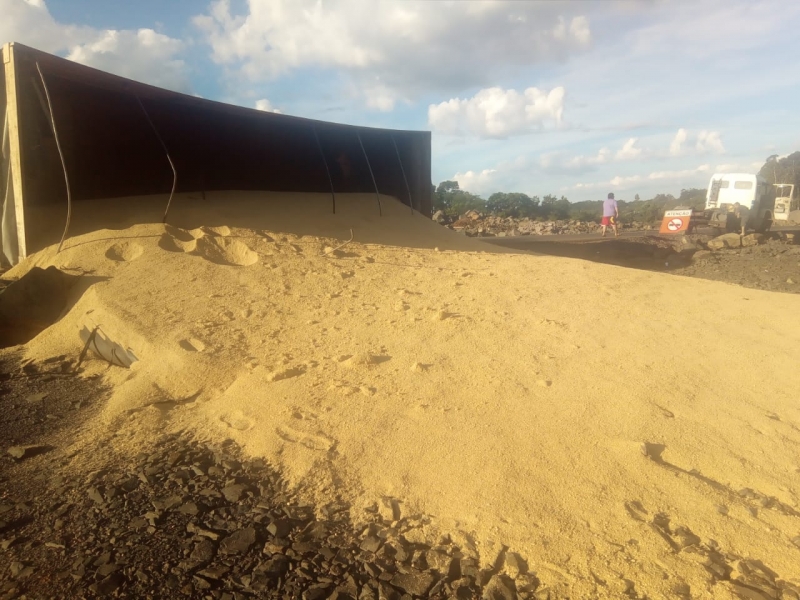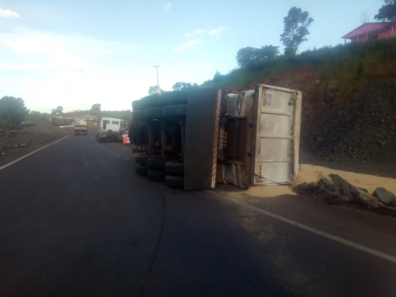 Aproximadamente 21 toneladas de soja ficaram espalhadas ao lado da rodovia após uma carreta se desprender do cavalo mecânico durante uma conversão.